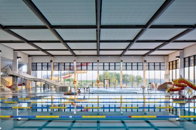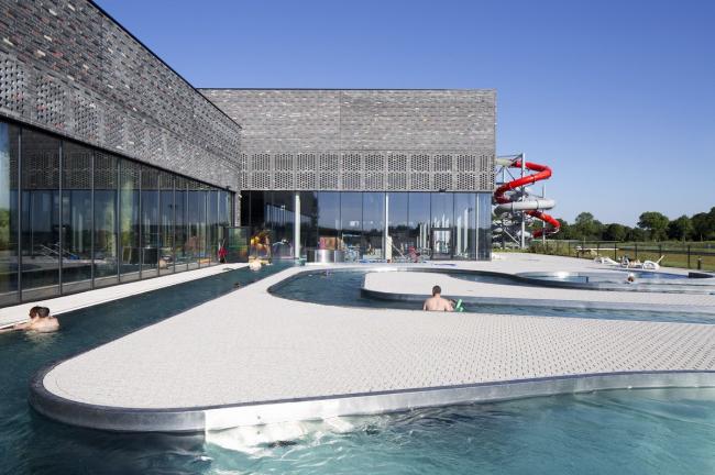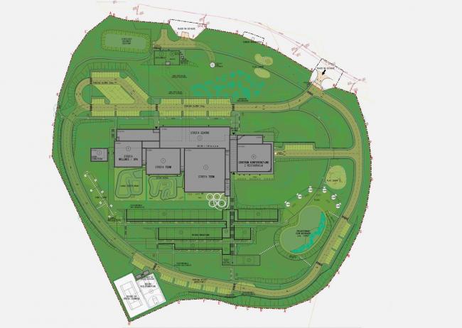 大楼的主入口是一个玻璃盒中枢,在那里大厅将建筑分成三个部分:主体设有游泳池和热水浴,第二部分设有会议厅和餐厅,第三部分则是一所酒店。从入口大厅可以直接到达酒店部分。
