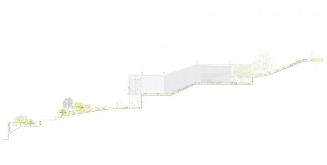 在这个系统中,这座房子从土地的较大斜坡上建起了一个大型的游乐场,在这里可以观赏并包围房屋景观,却难以被街道上人察觉。 在这个操场上,提供了更加不确定和多功能的生活方式。没有特定的地点来开展活动,而是取决于当地情况、气候和隐私,使项目能够发展成为满足欲望、需求或优化的国内事件。 在这个地方,“遥远的桌子”或“鱿鱼搜索灯”被设计为操场互动的大型装置。