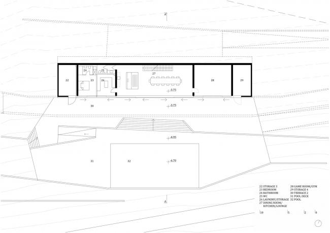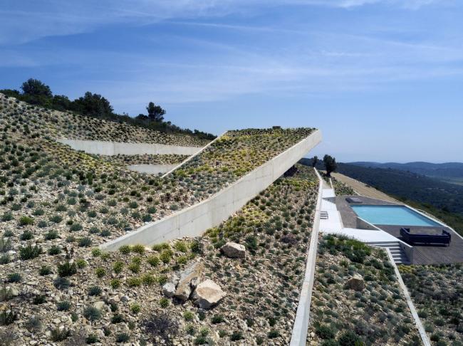 设计师设想这座住宅是一个在地下开凿出来的体量,一个从大地上掀起的口袋,一座人造石窟,一处唤起人们对原始住处记忆的空间。这座建筑一共有两层,一层布置着休息区,楼下则是布置在屋檐下的开放式餐厅,厨房,休闲区,以及露天的露台和泳池。