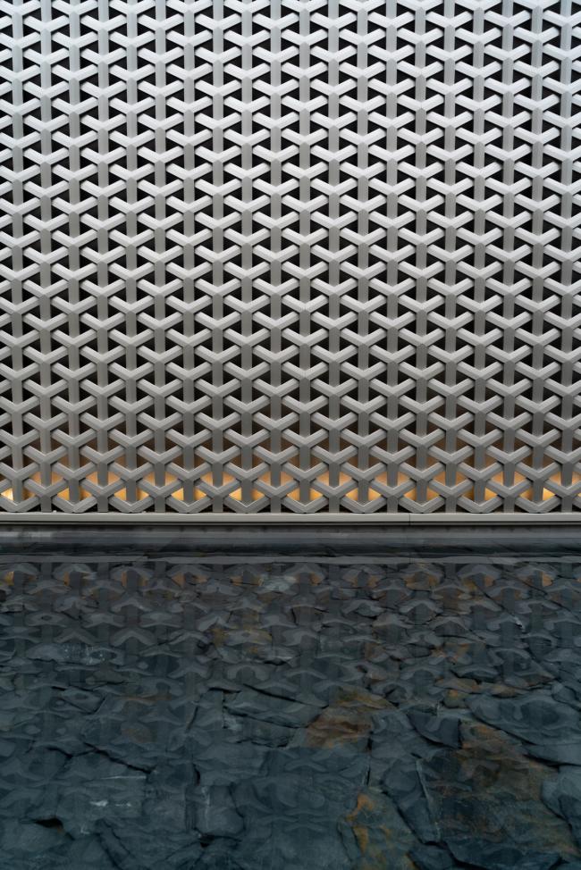 主楼立面用4500个Y型立体单元件编织起一张巨幅的金属网状画卷。Y型单元件全部手工打磨,在工厂中制成1.2m*2.4m的单元板,到现场进行切割和安装。照明系统安装在金属网的上下两侧,夜晚从三角形的孔洞中透出柔和的灯光,使编织网展现出与白天截然不同的剪影效果。