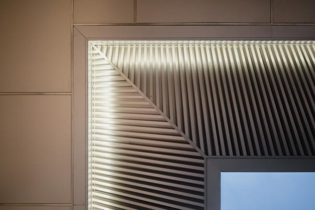 外轮廓收边的金属线条全部为定制产品:大到立柱、檐口、腰线,小到底部收边、门套,以达到极致挺拔的效果。定制的金属型材与设计所追求的力量感和简约美高度契合,通过交接处的细节设计,来展现设计者对于使用者的活动体验的关注,以及建造者精湛的施工工艺。