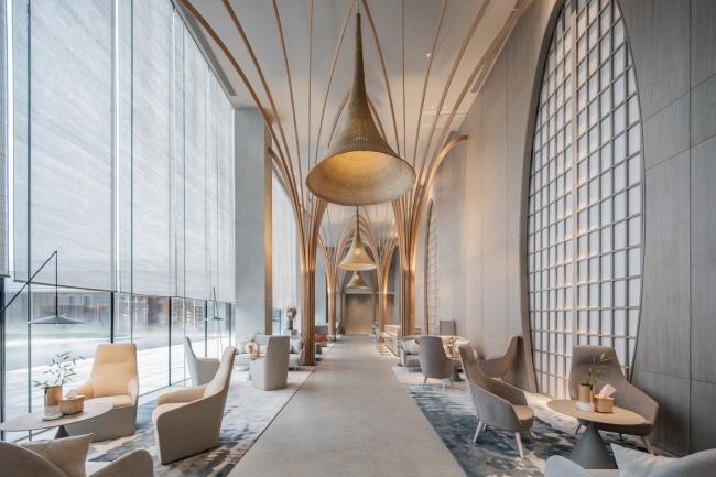 外廊通过延展的玻璃面、大尺度的灰空间、盆景式的内院,实现从室内到室外,由建筑到景观无界限的自然延续。为了给近人尺度提供舒适的空间体验,设计将大挑檐拆分成平屋面与坡屋面两个层次。内侧平屋面吊顶与室内平接,弱化室内与室外的界限,外侧坡屋面吊顶檐口略低,成为室内对内院景观的取景框。