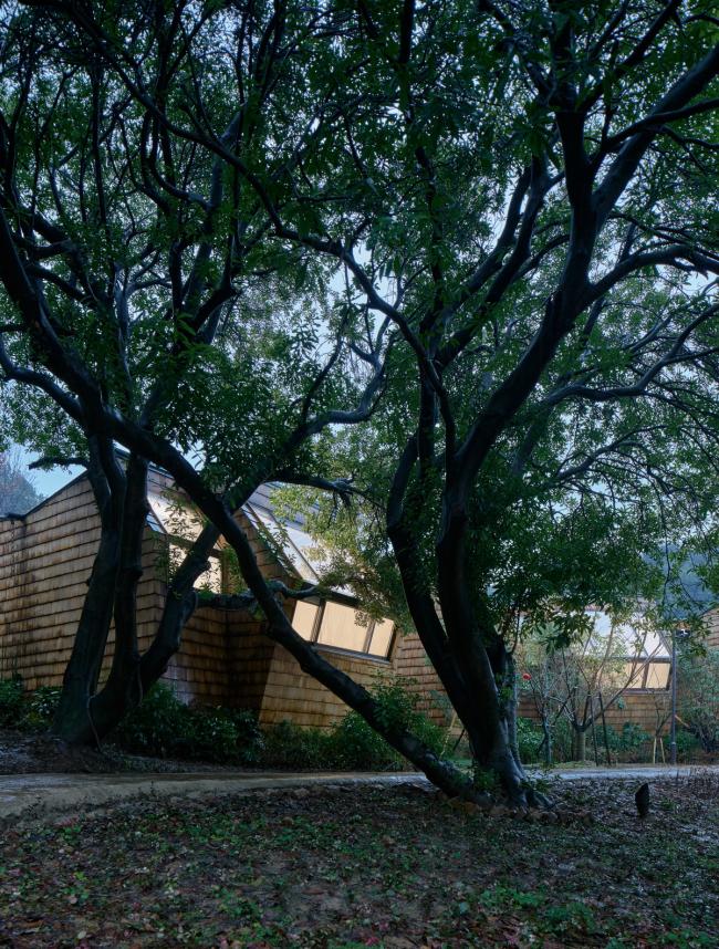 三年前第一次来到项目现场,迂回穿梭在一片密集又高大的杨梅林间,阳光艰难的从枝叶的缝隙中穿透下来,在地面上形成斑驳的光影,静谧但又显得有一点阴沉。走到林外的开阔处,便会不自觉的仰望眼前的这片杨梅林,顿时有种渴望“冒”出树林的冲动。建筑应该呈现一种伴随大树“生长”的状态,它不是孤立存在的,而是结合场地坡度和杨梅林,产生一种向上的张力,一种与环境一同成长的形态。“星立方”概念呼之欲出,它就像另一种有机生命体,在这片场地上和杨梅树一起仰望星空。