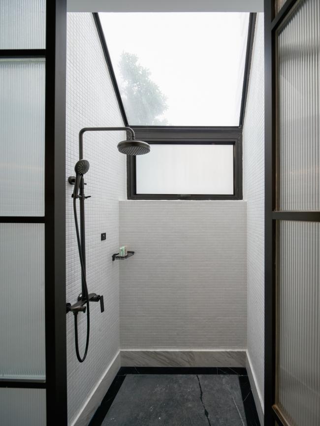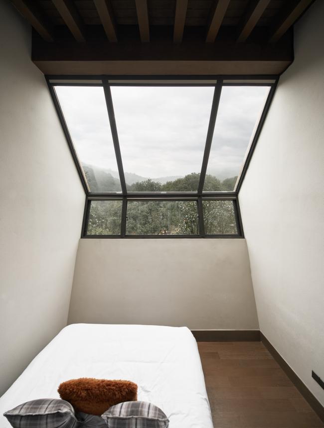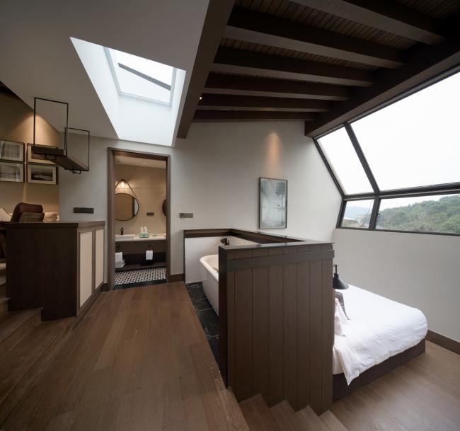顺应缓坡的地形,室内空间依次被划分成3个不同的标高,不同标高之间用错位的台阶联系。入口玄关为中点标高,并设置天窗,给予一定的引导。客厅位居高点标高,通过大面积的落地玻璃窗,联系室外庭院。低点标高便是卧室,希望躺在这里的人可以自在的透过窗户仰望星空,所以设计了一扇既不平行也不垂直的转折窗户,这扇窗户即满足了建筑采光通风观景的需求,也完成了建筑本身的神态注入。因为中间入户的原因,客房呈现少有的南北通透感,外部景观最大限度的引入室内。加上室内的高差,空间上形成丰富的层次感,每个功能空间相对独立但又彼此联系。通过这些独特的空间感受,希望每一个进入“星立方”的人都能感受到与众不同的乐趣。