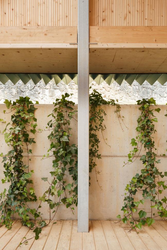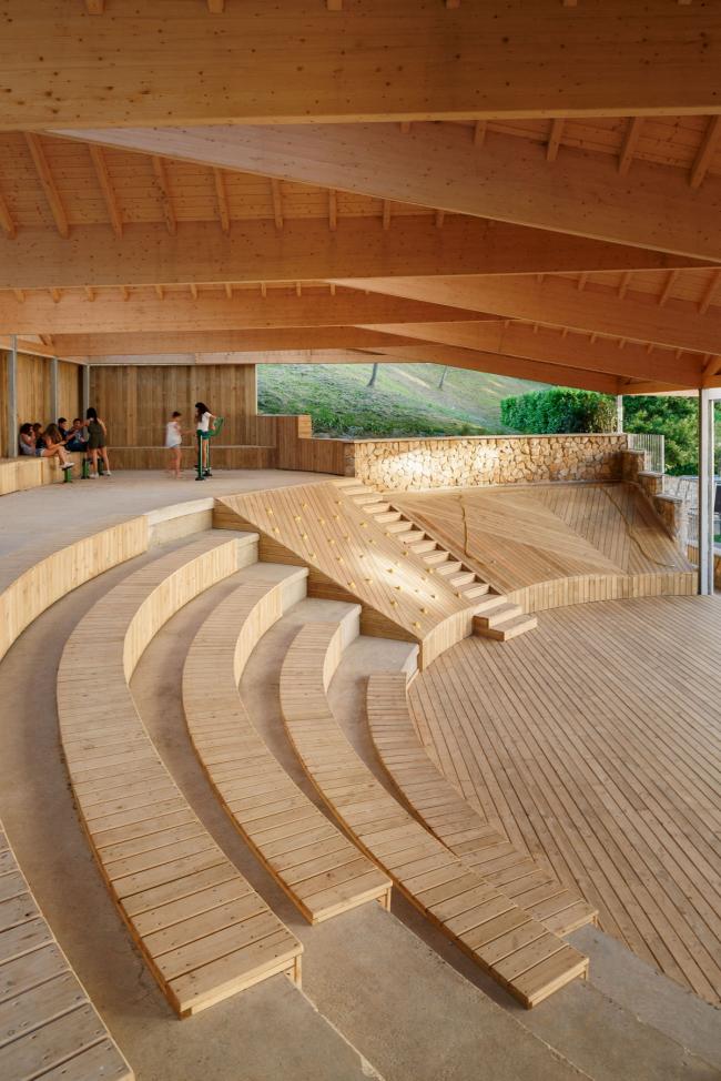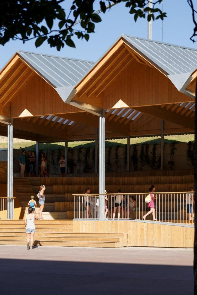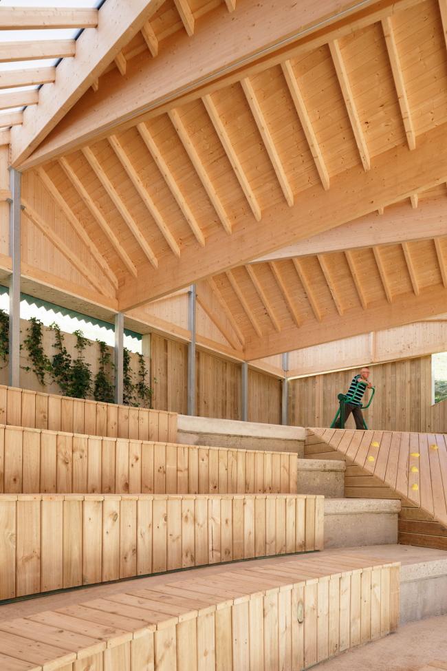 新的休闲区域布置遵循空间顺序。通过设置不同但又相互联系的空间,可以增加旧礼堂的用途。基于此种考虑,上部区域布置了康体设施,适宜老年居民活动。露天看台则有双重功能:提高了座位的舒适性,也方便观看公众演出(BIM设计)的观众照看婴儿。