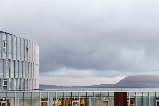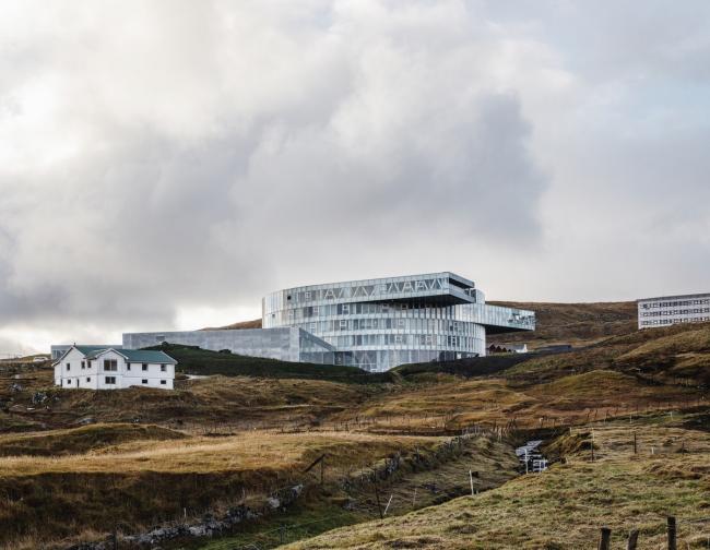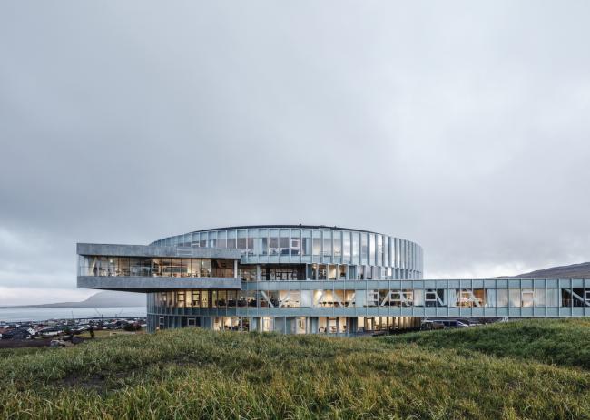 Glasir 位于法罗群岛波浪起伏的峡湾上,在那里可以看到首都托尔斯港,还可以欣赏到美丽的大海和湛蓝的波涛。该项目希望能够将法罗群岛体育馆、托尔斯港技术学院和法罗群岛商学院合并为一栋大楼,为1750多名学生和教职员工提供便利。