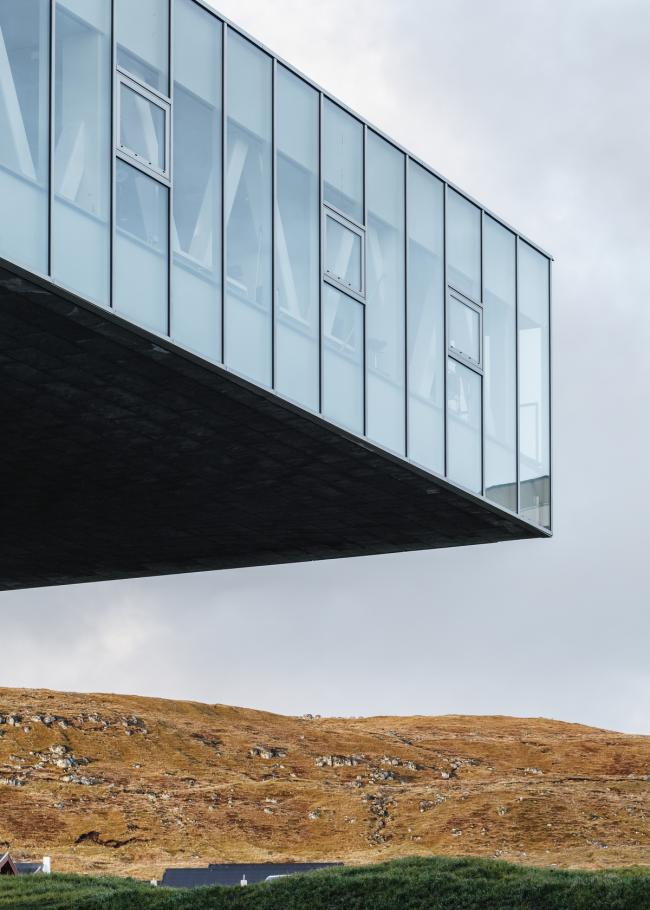 从外面看,外部玻璃幕墙安装在锯齿状的木瓦中,让直元素形成一种柔和的圆形形状,并融入了自然环境。随着时间的推移,种植在屋顶上的草将慢慢生长,这座教育中心将会逐渐消失在法罗群岛的景观中。