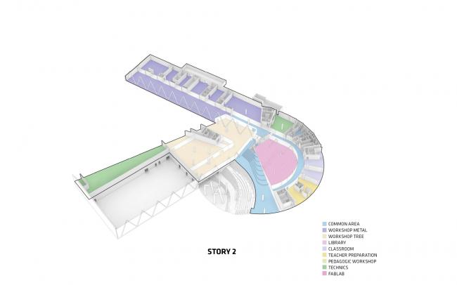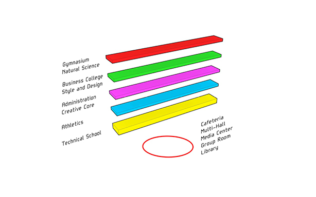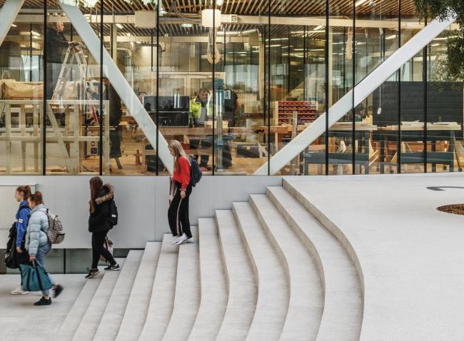由于场地呈陡坡状,学校的主入口可以从一座引人瞩目的人行天桥进入。来到里面,学生和老师立即就能体会到圆形庭院的欢迎气氛,它为所有楼层的学术兴趣创建了一个自然的聚集点。