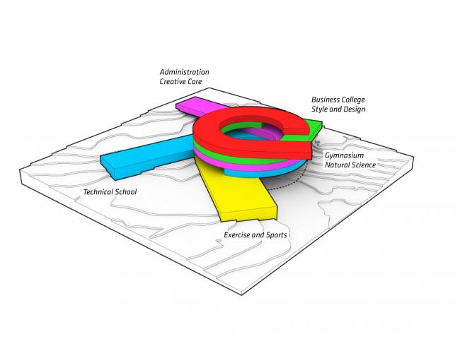 Glasir 保留了这三所学校各自的自主权和个性,同时为合作和开展教学活动创造了理想的条件 —— 这是一个创新孵化器,与传统的学校环境不同。它根据学生和教师的内部需求来进行设计,共有五个独立的楼层,围绕着一个中心庭院:三个机构各有一个,一个用作餐饮和各科系,一个用于体育锻炼和聚会。 建筑结构形状就像一个漩涡一样,每一层都向上开放,顶层向山地景观延伸出30米远。