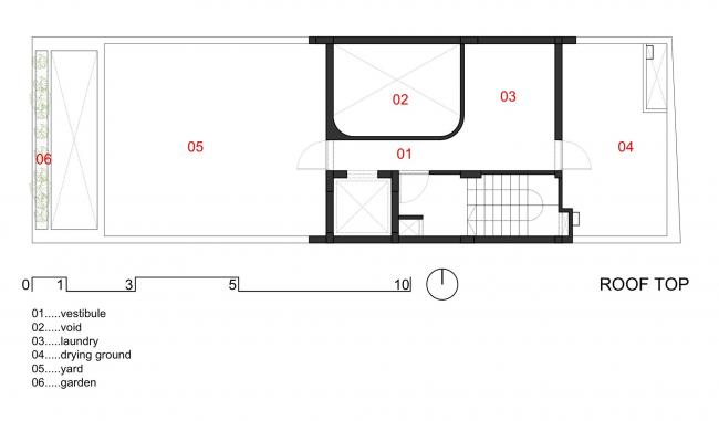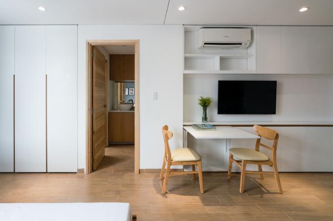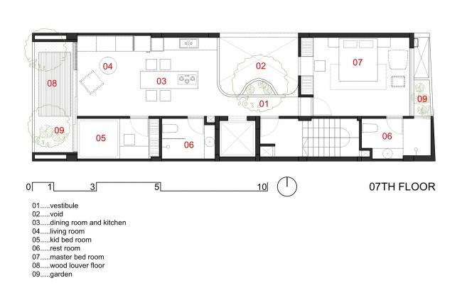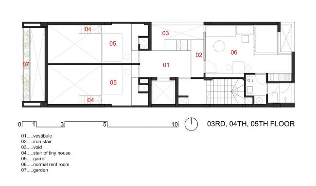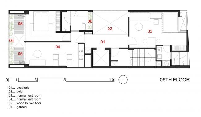建筑前部空间和后部空间拥有不同种类的房型也是十分经济的。顶层6层是一整套豪华公寓,有客厅,厨房,两间卧室和两间厕所。客厅和厨房相连,提供了更宽敞的空间,住户能够看到前面和天井的景色。我们使用衣柜和书柜来优化空间。