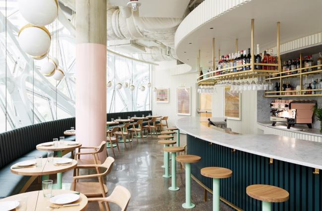 建筑与设计将传统的意大利美食与现代玻璃和钢结构相结合。设计团队的灵感来源于建筑独特的几何造型,以及现代艺术博物馆和美术馆明亮通风的环境。在球形外壳下,餐厅所在的区域被认为是一块很难处理的空间,因为它的大部分空间都是曲线。弯曲的皮革椅和展台都迎合了玻璃曲率。弯曲的墙体覆盖着漆过的木条,这样做的灵感来自于硬币两侧的滚花,它们区分了厨房与其他区域,除此之外,意大利大理石台面充斥着这个空间。