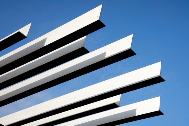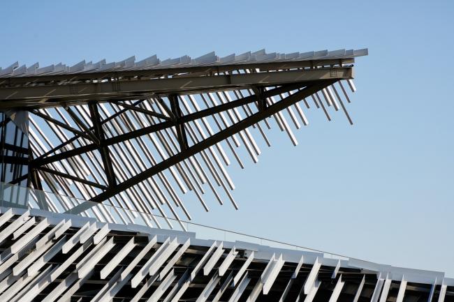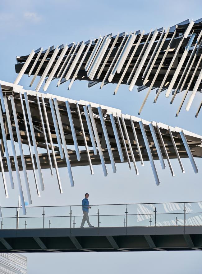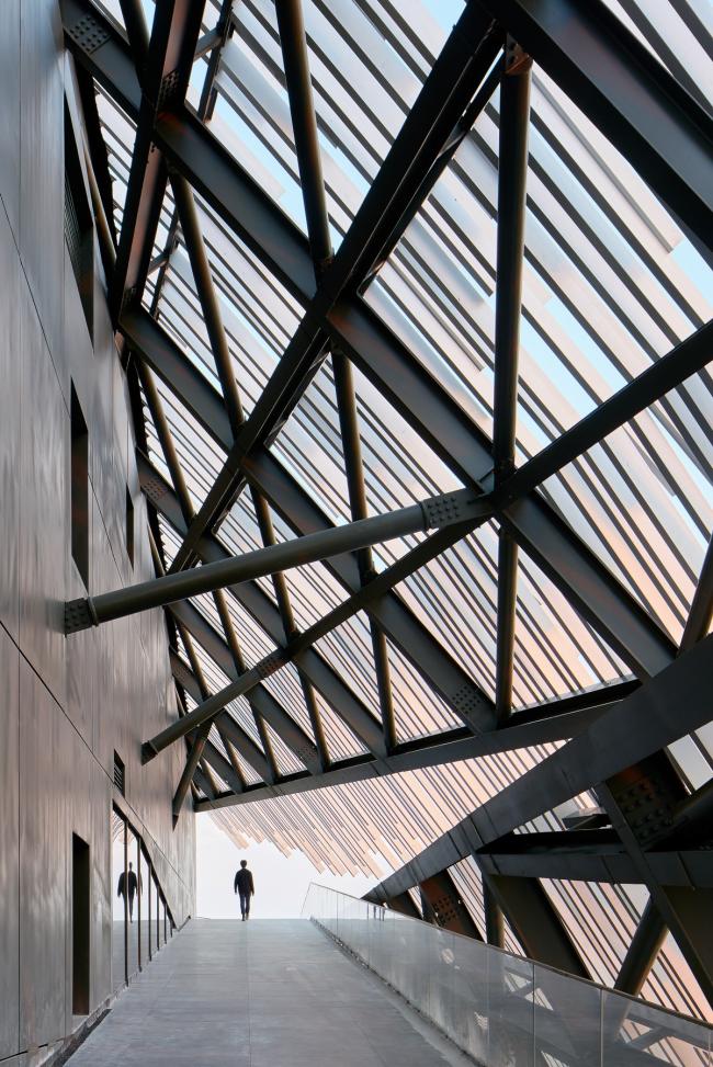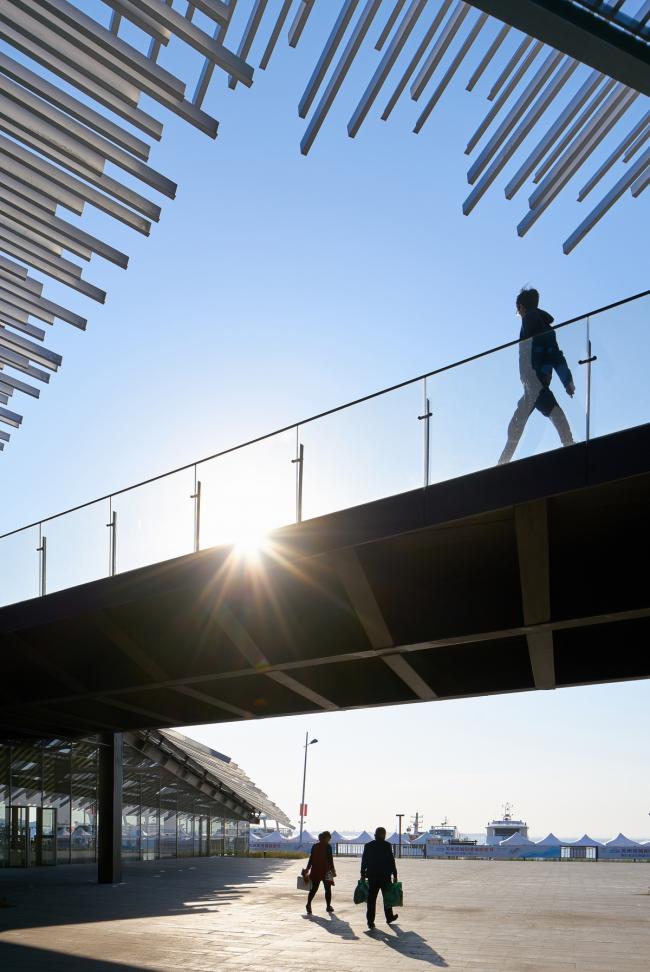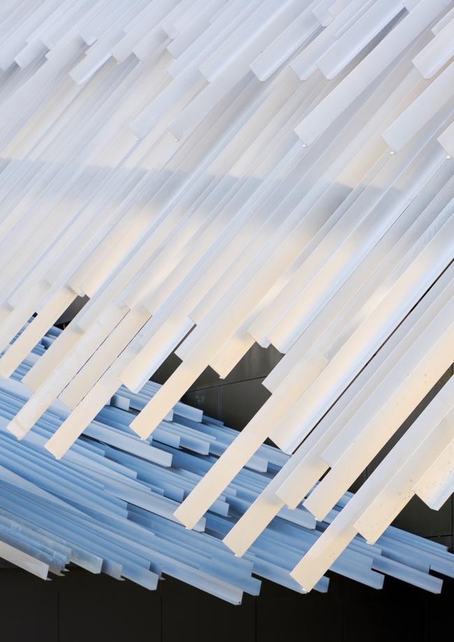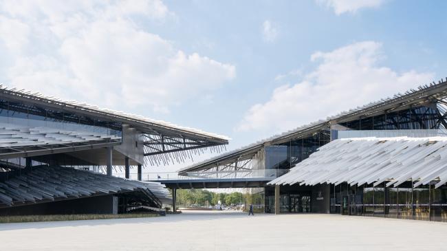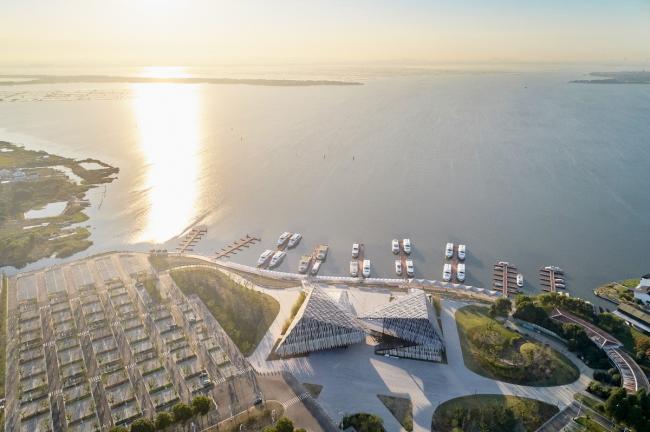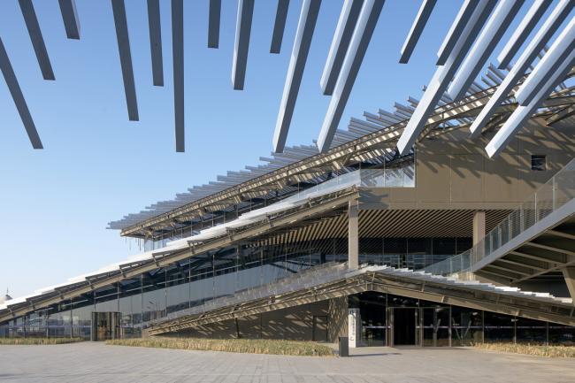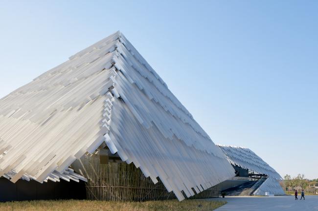 中国摄影师施铮拍摄隈研吾在中国苏州的建筑作品“阳澄湖游客集散中心”,设计的目标是通过对尺寸相同的挤压铝材部件的随机放置,来构建一个巨大的、形似山丘的地貌形态结构。建筑内部也设置了倾斜的地面,以便与外部保持相同的类似于山丘的形态,从而为游客带来一种轻松且不受束缚的感觉。