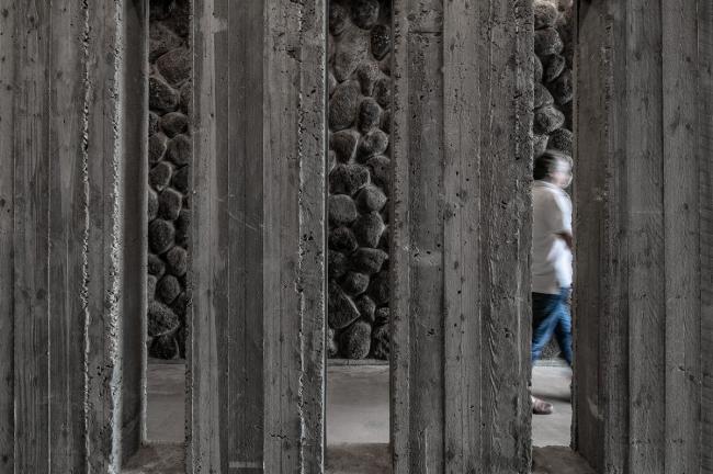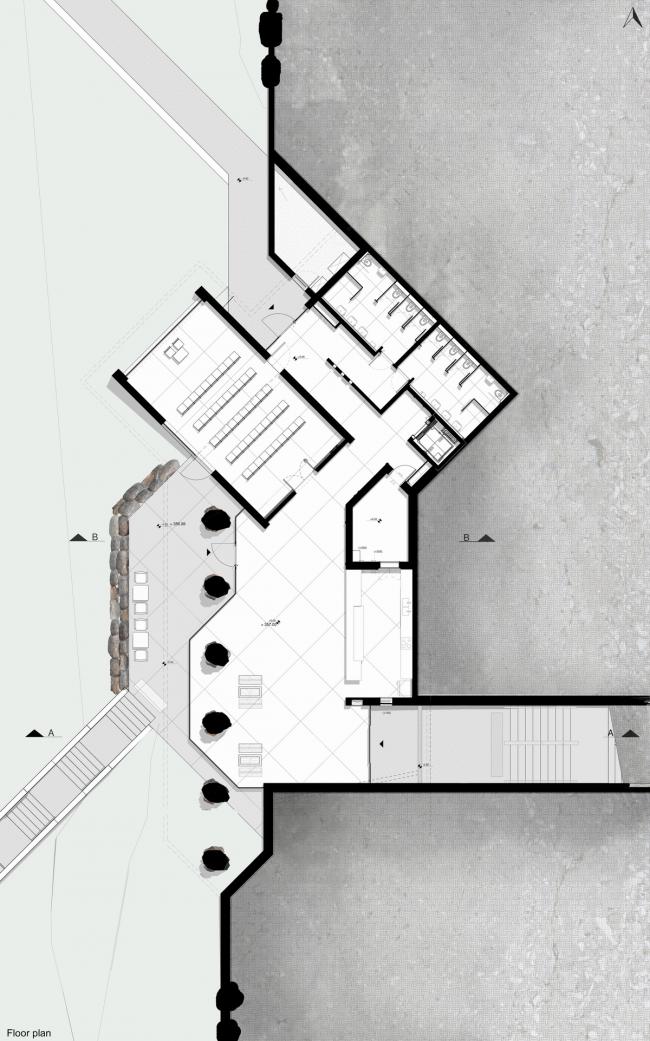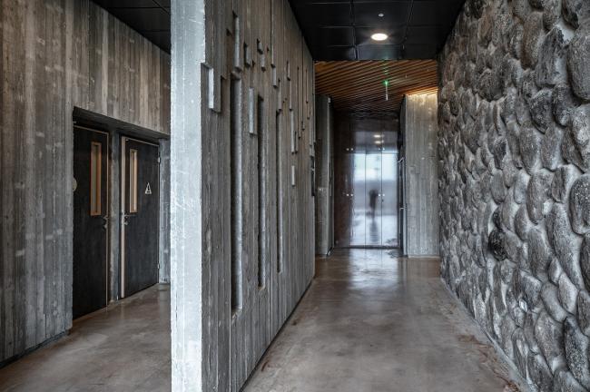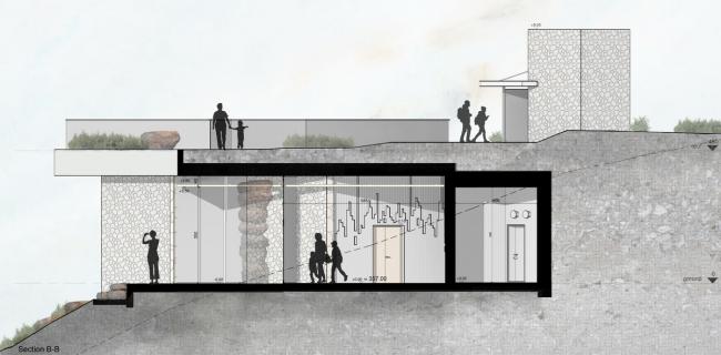 在这里,野生的自然、地形、地质、戏剧性景观、历史故事以及重要景点等要素均需要一个结构进行调解中和。本案的主要挑战就是将所有这些要素进行整合,尽可能保持原始场地的真实性。通常,建筑方案的规划始于水平方向进行的功能排布,然而在这里则是从垂直方向的剖面图开始的。因此,新的空间于场地的地形之中呈现,只有一个透明的立面向西而立。由内向外看,不需与场地内原有“明星”相争就能一览室外所有的主要景点。