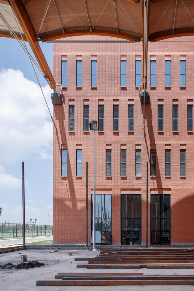 设计之初提出“体育仓库”的通用性与运动建筑需要表达的结构性相结合,以简洁高效的空间组合为原则的南北两个盒子,采纳了整个校区的红色清水砖基调,但演绎为扎实稳重的同色陶砖,开窗简洁现代,且进一步去除了繁琐的装饰艺术,顺着校园内环向外,演绎出逐步加强的现代风格,(BIM教程)诠释了“和而不同”的整体设计理念。
