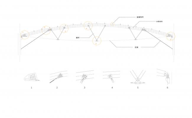 半室外网球场所旨在补充户外网球场雨天不能使用的缺陷,上部覆盖的钢木膜结构,跨度达45.6 米,为多榀双向拱形结构,结构形式轻盈独创,建筑形式新颖优美。其中的大跨度钢木结构,旨在追求体育建筑力与美的结合表现,而膜与拱形钢木结构的排水措施和收边节点,体现了建筑师与结构师、膜结构厂方以及现场施工人员的高度配合与协同,最终不露痕迹地解决相关节点设计,呈现了结构成就建筑之美的设计追求。