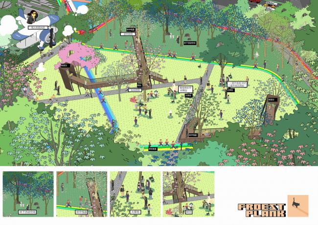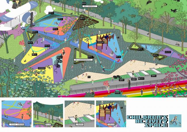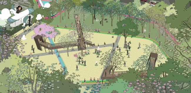 北侧的“运动森林”为主要的户外活动场地。作为主体建筑与北侧公园的过渡,跑道形成的空间纽带串联起了整个空间。围绕中庭在二层有一条空中跑道,跑道同时通过外部的台阶与室外的跑道互相串联,沿着室内跑道可以观赏室内的体育活动,中庭表演,沿台阶到达室外又可以享受绿化景色,新鲜空气。