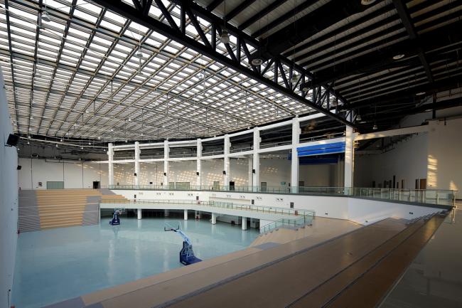相对于竞技体育建筑,群众体育建筑在中国是一种相对新的建筑类型,对于体育功能的定义,理解和空间配置方式提出了新的要求。我们提出了泛体育功能的概念,特点是自由空间,交流空间和复合空间:主要活动如多功能厅,泳池,羽毛球篮球等功能围绕共享中庭布置,最大限度地鼓励不同功能在视觉上和行为上的交流和互动,充分体现群众体育活动的行为特征。中庭为公共复合空间,可以组织社区活动,小型演出等活动,平时可以作为攀岩场地和轮滑场地使用。