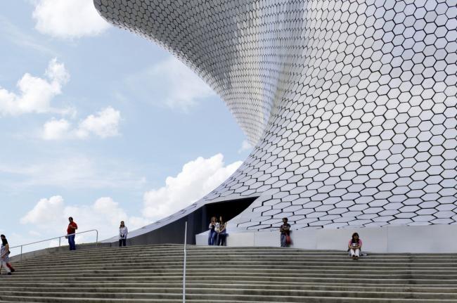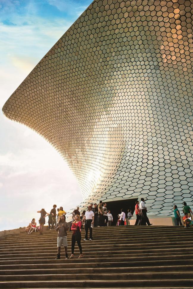 一部通往博物馆入口的大型楼梯激活了周围的公共空间,成为游客和来自附近卡索广场的当地人的非正式集会广场。建筑表皮由16 000块六角形镜面钢瓦组成,参考了传统的殖民陶瓷瓷砖建筑立面,根据天气和参观者视角的不同,博物馆展现出变化多端的外观效果,这样的表皮同时还优化了整座建筑的可维护性和耐用性。