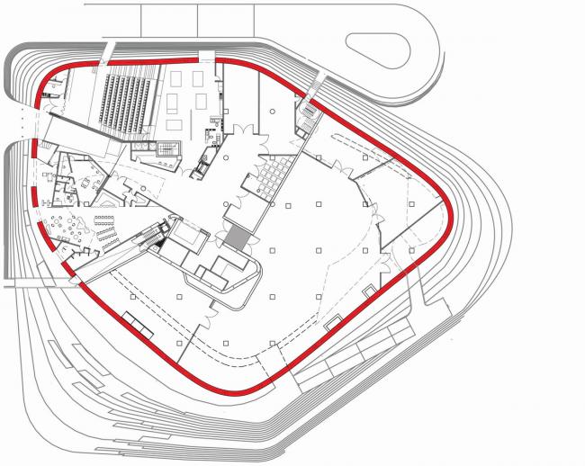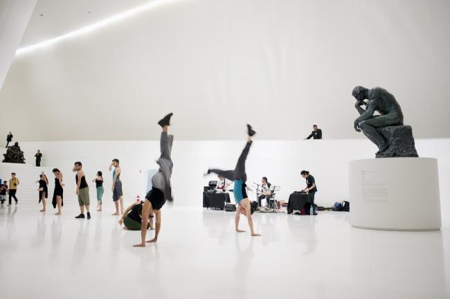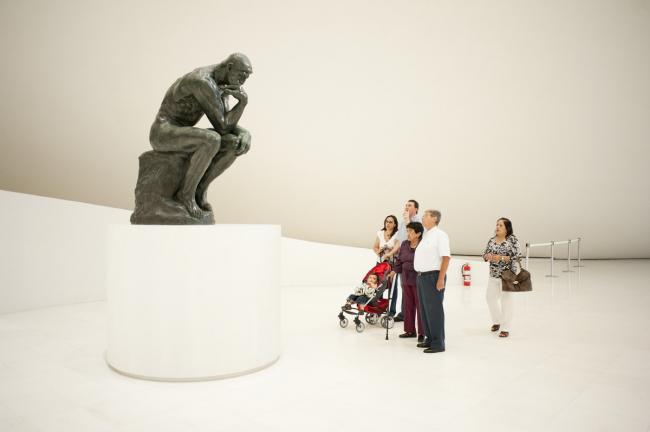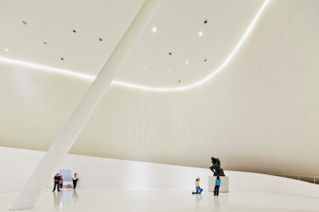 在博物馆内部,参观者首先看到的是在宽敞的白色门廊中展出的罗丹的《思想者》雕塑,它鼓励着参观者继续探索博物馆。沿着盘旋在博物馆六个楼层中的连续步行道向上走,参观者就会发现梵高、马蒂斯、莫奈和达利等大师的作品。坡道一直通往顶楼展厅,这里有着由众多雕塑组成的景观,而且环境雅致、自然光线充足。
