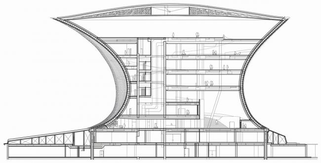 索玛亚博物馆之所以有复杂的几何形状和雕塑般的外形,是因为使用了大小不同的28根独特的弧形钢柱,它们被整合到了建筑外壳中。为了实现建筑在多个面向外悬挑,结构由分布在每个楼层的(BIM工程师)共七个环组成的系统加固。索玛亚博物馆还有一些其他的公共区域和私密区域,包括一个350座的礼堂、图书馆、餐厅、礼品店和行政办公室。