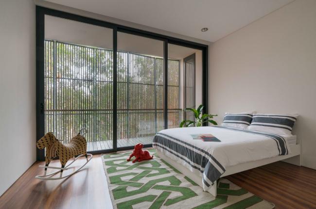 客户的房子外面有两棵长成的树,客厅和儿童房面向前方,无需过多的遮蔽。尽管如此,为了与房子的安静特征保持一致,以及减轻隐私问题,在立面的每个开口处都安装了木屏风。