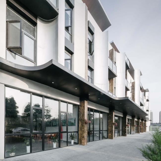 我们选择正交与曲线组合的这一形式母题,将“素胚瓷片”抽象为片状弧面,结合不同建筑部位,有着三种谱系演绎:内凹的弧形门斗、适应不同空间尺度窗户的弧面窗套、联系阳台上下层贯通的弧面钢板幕墙。这些被系统组织的弧面作为构件,散落在厂区立面的各个位置,赋予建筑特有的立面特征,由此呈现出申窑的主调性。