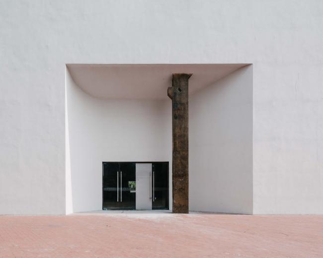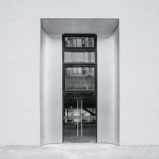 南立面主入口大尺度的门斗设计,将厂房独有的空间特征向外立面延展。门斗空间裸露出通高结构的单柱,在揭示室内空间的同时发挥空间趣味。