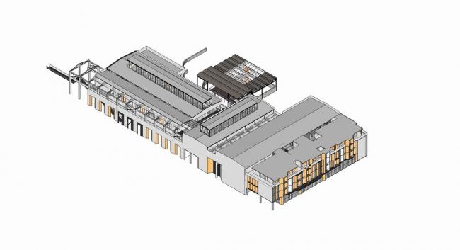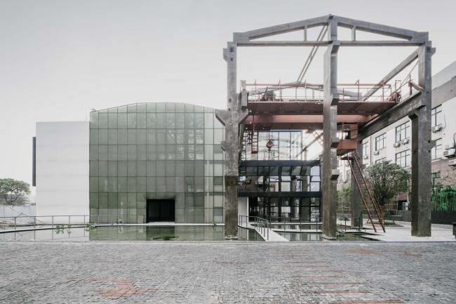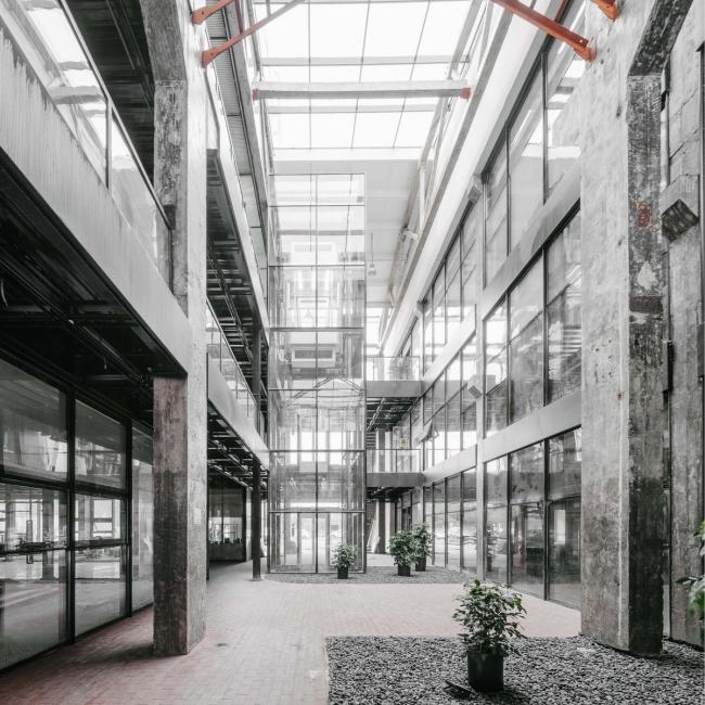 厂房西侧突出的墙体与屋顶被拆除,作为将来酒店的前场,完整地露出钢筋混凝土的结构骨架。遗留构架的包裹,形成清晰的建筑体量关系,引入玻璃钢格栅幕墙体系,在保持体量完整的前提下,增加室内空间采光,增加立面丰富性。