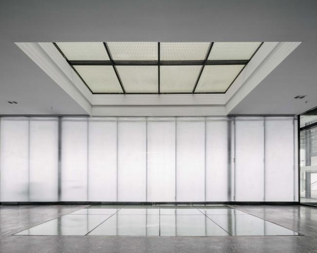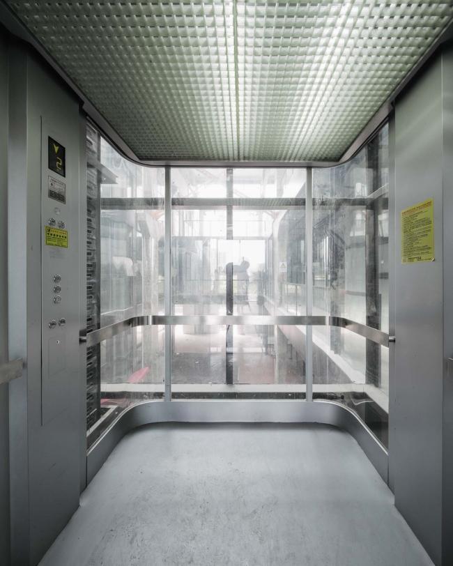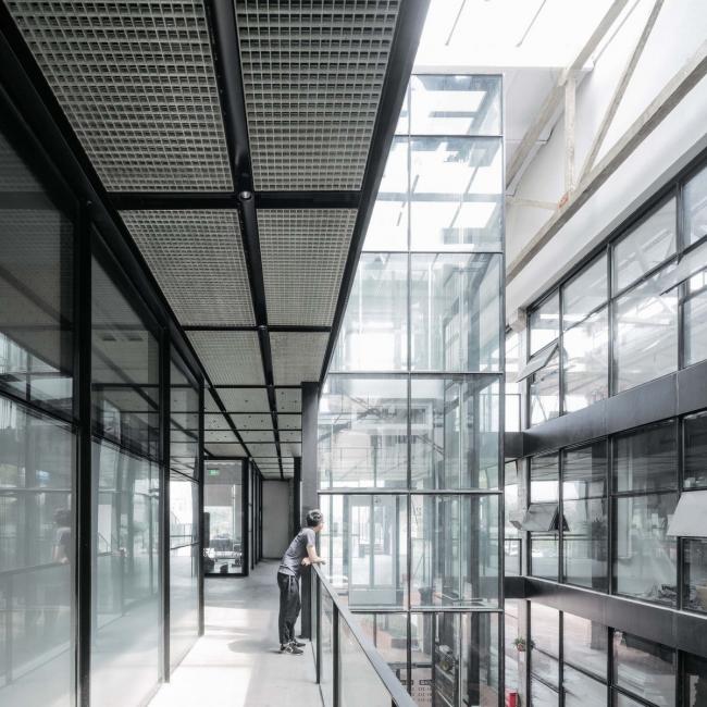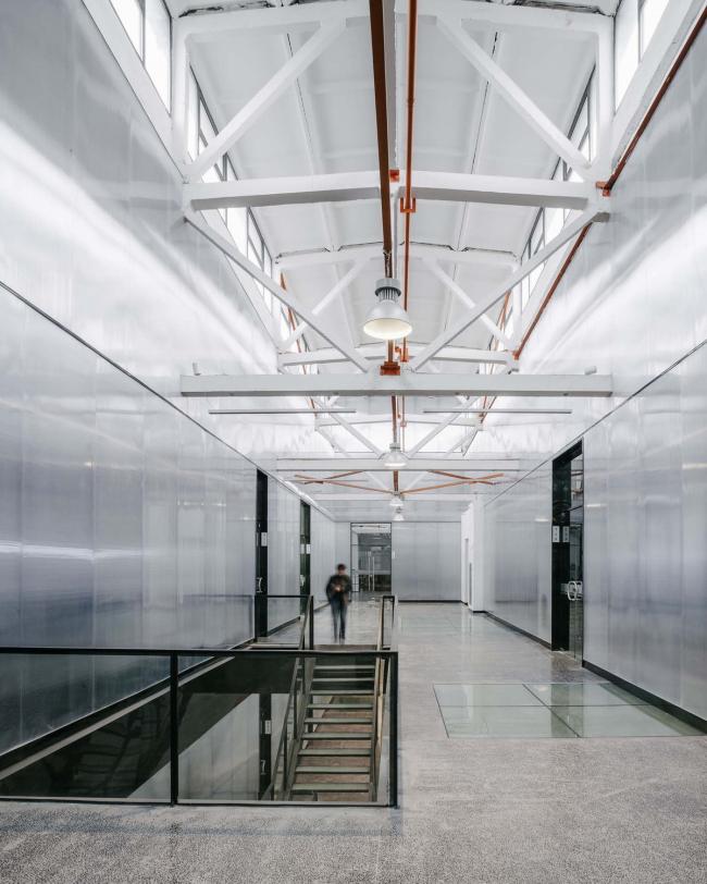 西侧主体厂房内部增加了钢结构来划分出三层主要空间:在公共走廊区设置一组顺应结构的长天窗以及三组方形天窗,将光线引入室内穿透至各层;错落布置玻璃钢格栅+钢化玻璃楼面,更多的光线被引入厂房的中心区域,光线透过玻璃钢格栅被细分成小尺度的方格形状,在平静的办公空间中与使用者产生互动,感受光线的流动;公共走廊两侧的房间内,置入半透明的阳光板+玻璃的双层隔断,改善原来空间的采光缺陷又满足艺术空间需要的安静。