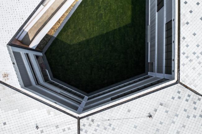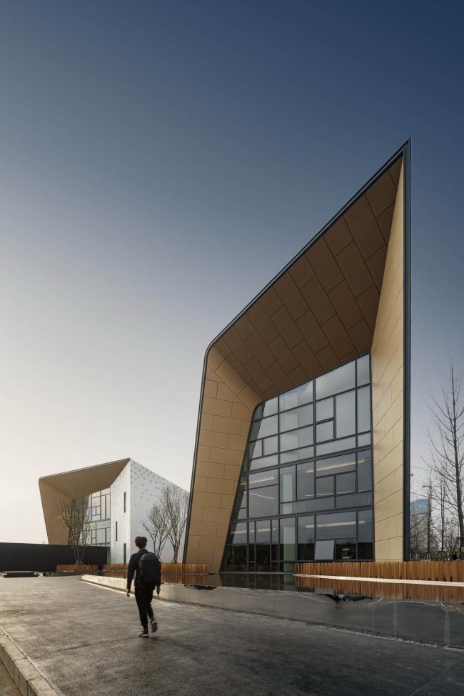 布局上,结合异形地块建造复杂而又统一的建筑体。基本几何形和组合方法来表达建筑的本质,建筑沿着台地围合出入口广场、中心院,并从形态上向对外打开,一同围合而成,从实到虚形成一个隐形的环。
