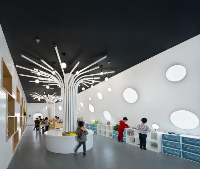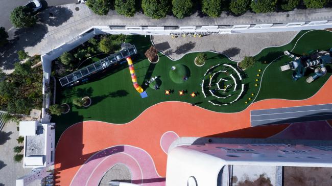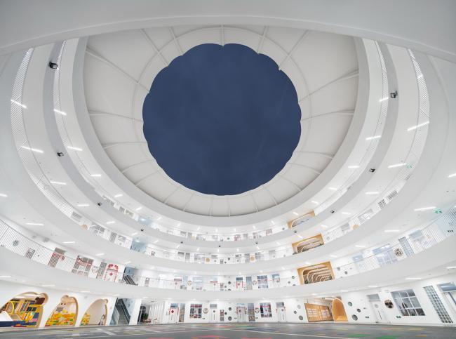 中庭空间增加了建筑的流畅感和流动性,内部空间以白色为主,地面则以彩色为主有活跃气氛的作用,中庭空间是孩子们最主要的交往场所,圆环路径,简单,统一,孩子们可以在明亮流畅的中庭肆意奔跑,也能让孩子们更自由自在的使用空间。