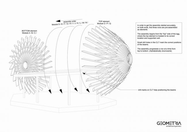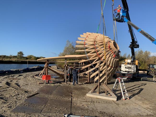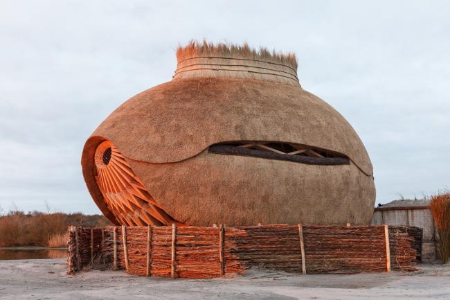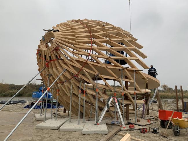观鸟屋是根据白嘴端凤头燕鸥的鸟蛋形状建造在沙巢上的,就像天然的鸟巢一样。“鸟蛋”的巢由垂直排列的栗木条、芦苇以及小沙丘构成,“鸟蛋”本身则通过参数化设计实现了形状、结构完整性、木材尺寸以及开口尺寸之间的良好比例。该结构在工厂预制完成后进行拼装,以便通过小尺寸的木制单元来实现较大的跨度。