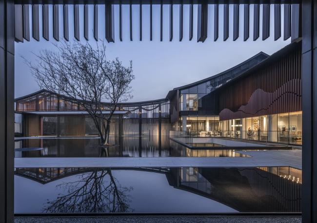 鸟瞰院子被水环绕隐于闹市,建筑呈山势,与入口、围廊和院内水景共成山水合院。入口风格简洁现代,点线面配以仿木格栅,渲染出东方文化的诗情和韵律。入口处用灰空间和(BIM教程)格栅增强建筑内外之间的联系,格栅半透出院内水景与对面围廊,景在院先;院内空间随屋顶山势高低错落,抑扬顿挫,围廊一侧是轻透格栅,可倚廊观山品水,格栅与卷帘垂水而立倒映水中,富有江南风情。玻璃幕墙与金属格栅带来简洁现代感,大面积镜面水景映衬着屋顶山势和垂坠帘幕,半隐半透娴静雅致,通透转折间也蕴含着东方的含蓄。步道以极简的几何水景串联出“曲水流觞”的东方诗意,以现代感的空间展现出传统东方庭院文化。