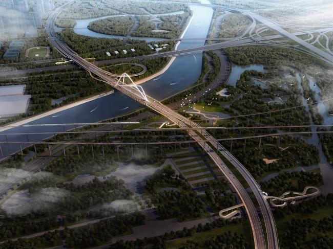 南京承天大桥,横跨秦淮河岸,南侧穿越京沪高铁,北侧紧邻绕城公路,连接城市CBD和生态公园,是南部新城重要门户和城市地标。
