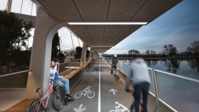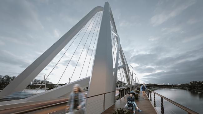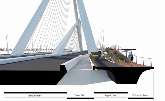 承天大桥的轮廓延续了南部新城完整而跃动的城市天际线,为城市景观增添新高潮。人行、非机动车、机动车,在这里被有效地隔离开,不被相互干扰。在承天大桥主桥上,开创性地采用了双层人非桥,使行人与非机动车分离,保证行驶安全的同时,使慢行系统的人们充分感受到秦淮河畔的风光。