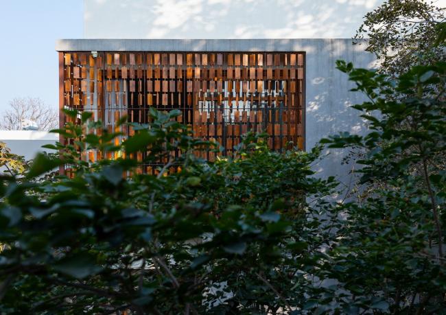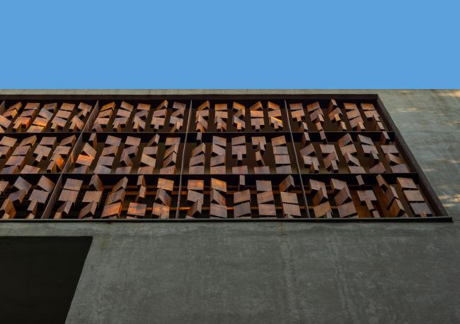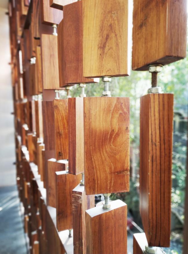 探讨算盘幕墙设计的方式时,我们倾向于使用自然材质。天然石材和砖砌面墙组成了室内基调。木工剩余的柚木材料被用来打造出算盘幕墙。栓在金属细杆上的可转动木块,打造出一个绝妙的立面。