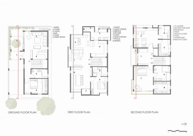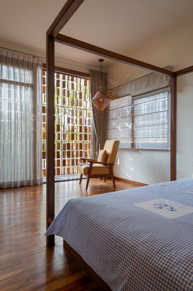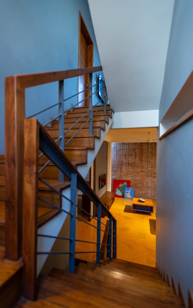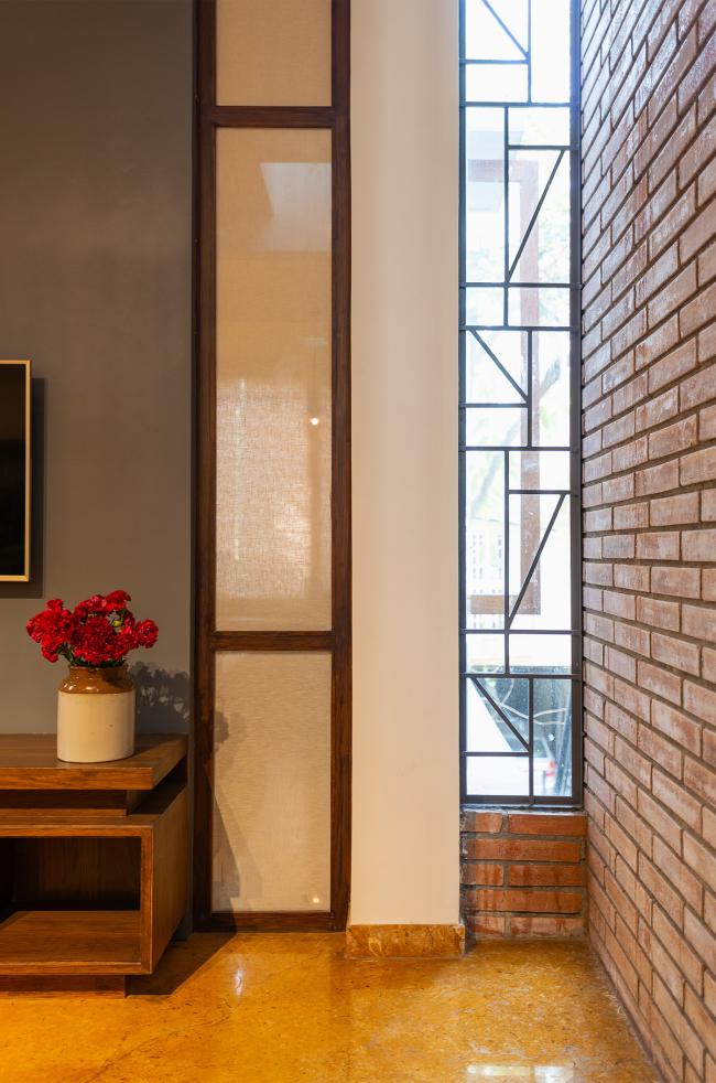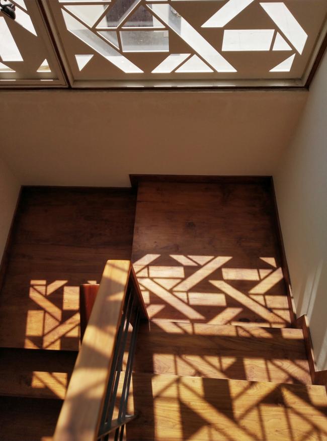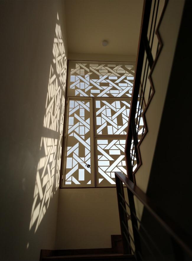 为了更好的采光通风,每个角度都经过考虑。首层的起居室向庭院开放,二层的隔墙被取消因而过滤后的光线能进入住宅中心。装设一英尺宽固定玻璃的竖向细窗令反射的水平光线进入建筑内部。自然光透过三层露台上的图案格栅,令光线从上方投入到建筑中。三层设有一个狭窄的露台和一道大面积楼梯窗户,使得光线可以进入到建筑的核心空间。