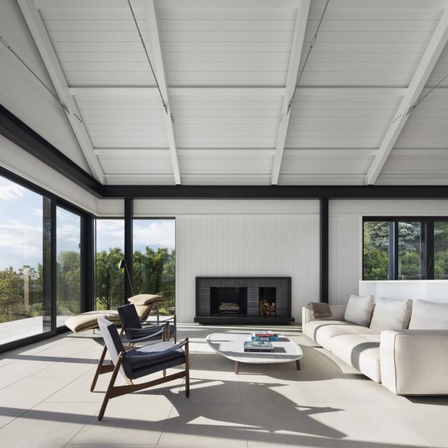 内部,则是现代与质朴风格的结合。外露的钢架结构横跨大面积的节能太阳能玻璃,增加房屋轻盈的感觉,同时支撑着一系列厚实的实木屋顶桁架,它们被漆成了白色。中和色调的白与浅色调的木材搭配深颜色(BIM),营造一种宁静又有活力的美感。光滑和粗糙的彩绘木板,手工制作的摩洛哥瓷砖,欧洲白橡木制成的地板,让这里看上去更为原始,加强建筑与自然相互呼应的效果。