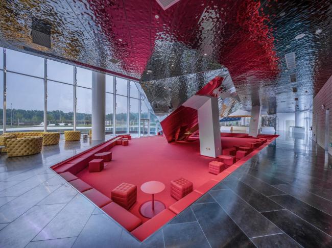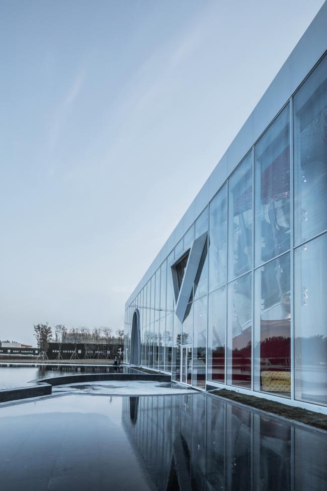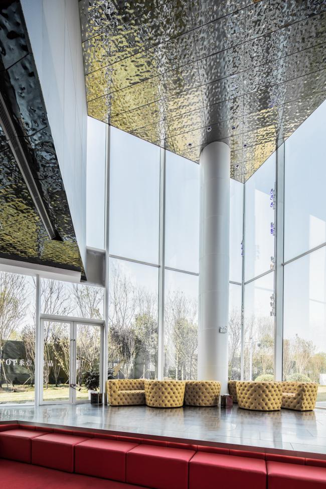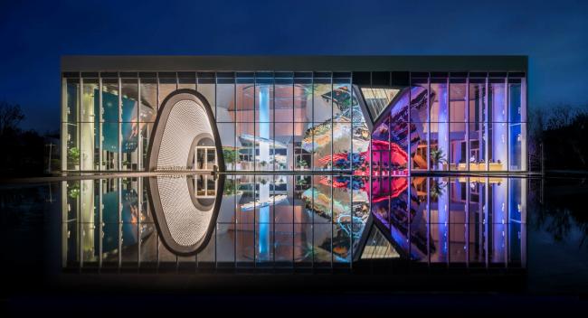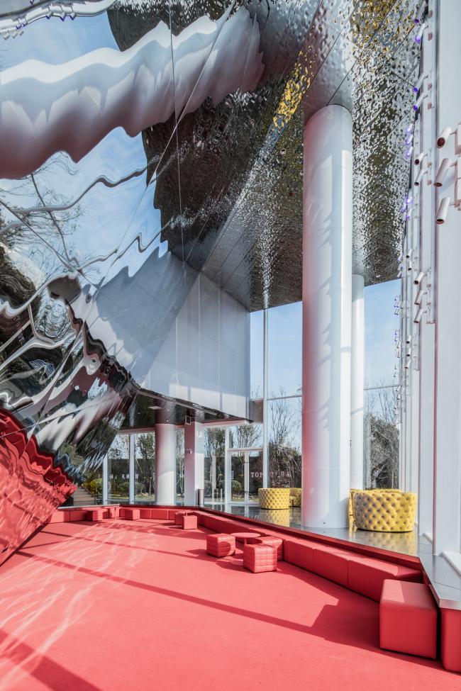 漂浮在空中的物体形成丰富而有层次的空间,以一种开放动态的姿态欢迎周边市民的到来。有的物体在空间中与玻璃外表皮碰撞并留下痕迹形成独特的建筑形象。建筑立面采用通体高透的超白玻璃使得整个建筑内部的物体,空间,材料,色彩对外部城市空间一览无余。透明,开放融入城市空间。形成了一个区别于传统售楼处建筑充满活力的城市公共空间。