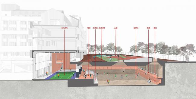 根据前期的调研考察,建筑师针对旧综合楼东立面实施了较大程度的整修设计,改变原有稍显厚重的外立面装饰,以轻盈的落地玻璃窗和金属墙面代替;增加操场的绿化面积,并进行大量的整治修复工作,提供更多的户外活动空间,塑造高低起伏的生态草坪。