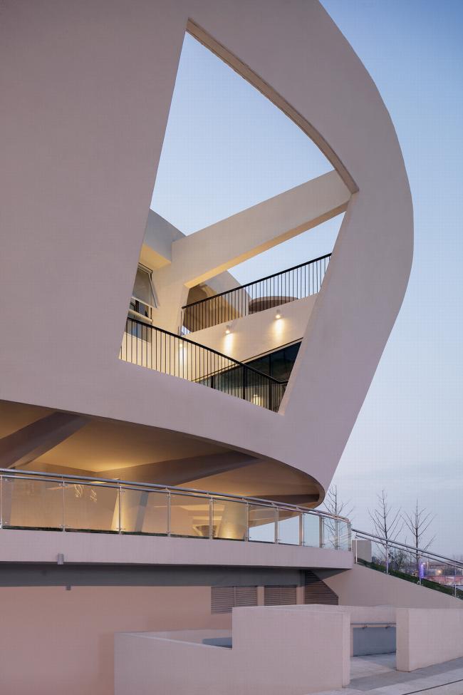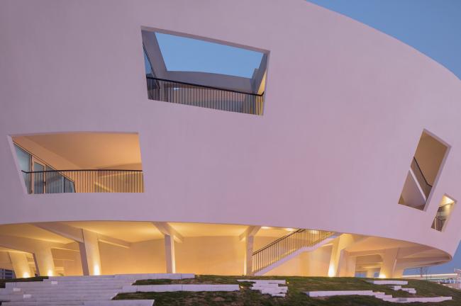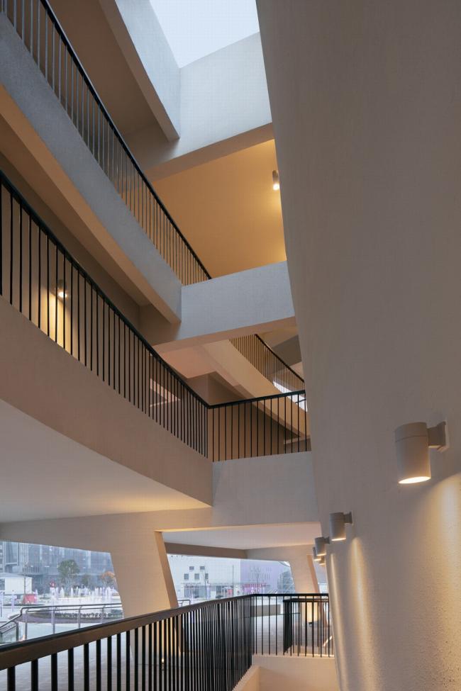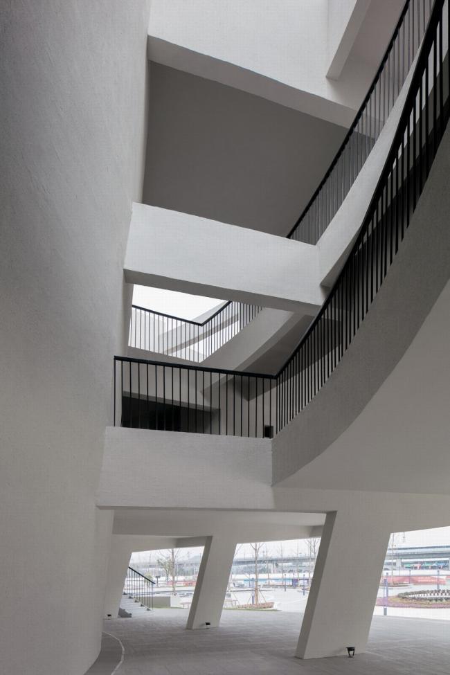 处于内外环之间的日常型空间设于三、四楼,通过二层的架空及斜坡与城市广场连成一体,为市民提供一个良好的可达性。局部楼板镂空及户外庭院的设置产生空间流动性,模糊了室内的界限,同时让二层架空层的绿植往上渗透进一步模糊了上下空间的界面。所有日常型空间通过内置庭院通风采光,利用阴影温差产生气压达到自然通风作用,适合南方气候特点同时使得外环立面呈现洞口“舞台”形象,每个洞口均面对城市不同场景:音乐喷泉、接待中心、河岸、婚庆广场、回转艺廊等,产生步移景换的戏剧性效果。外环材料单一性保持“环”的空间概念清晰可读,创造一个内向开放的空间氛围。