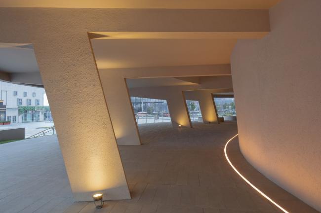 处于内环的4层通高的秀场场馆与城市广场下沉半层高差,观众通过与广场相连的大台阶直接进入。其后勤及设备房间被斜坡植被覆盖位于架空层下,后勤及展品通过地下车库进入。不同高差处理达到分流作用,互不干扰,适应不同使用模式。