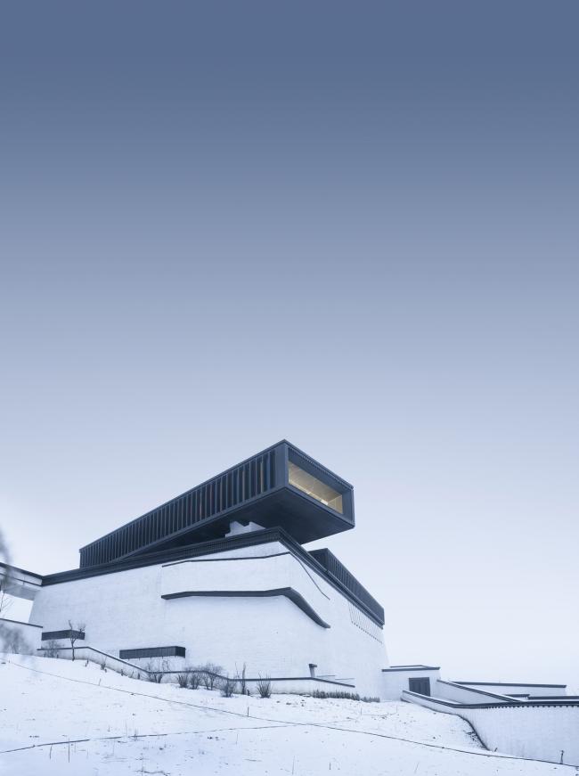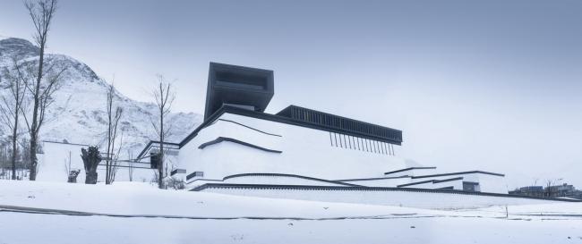 在设计之中,“天路”概念体现为三个层面:首先是物理层面的行走路径,它提取自布达拉宫之字形步道的原型,经过抽象的演绎,构成了从场地入口迂回上升进入建筑,以及在博物馆内部螺旋攀升的基本空间动线。