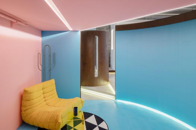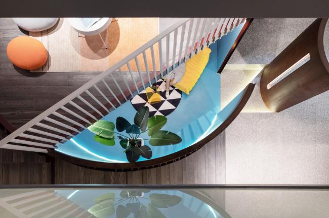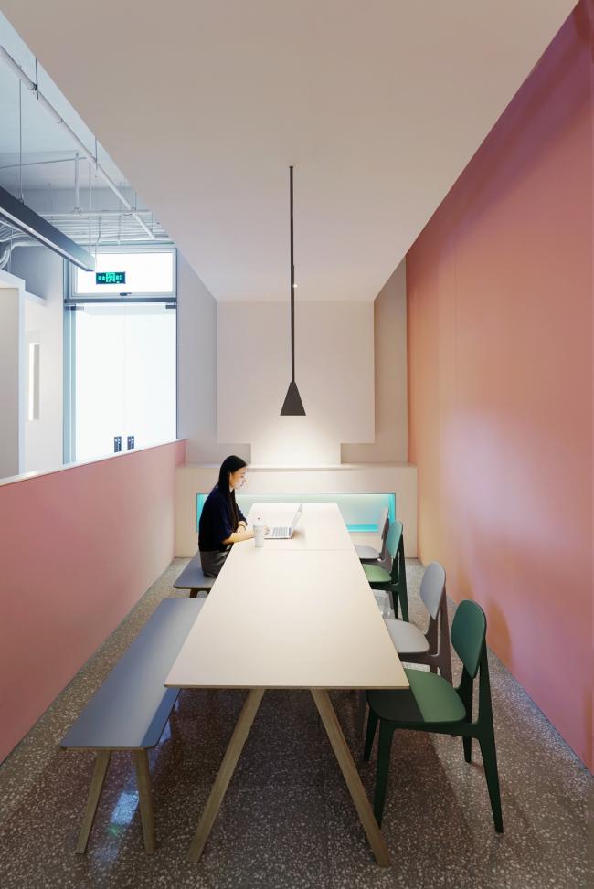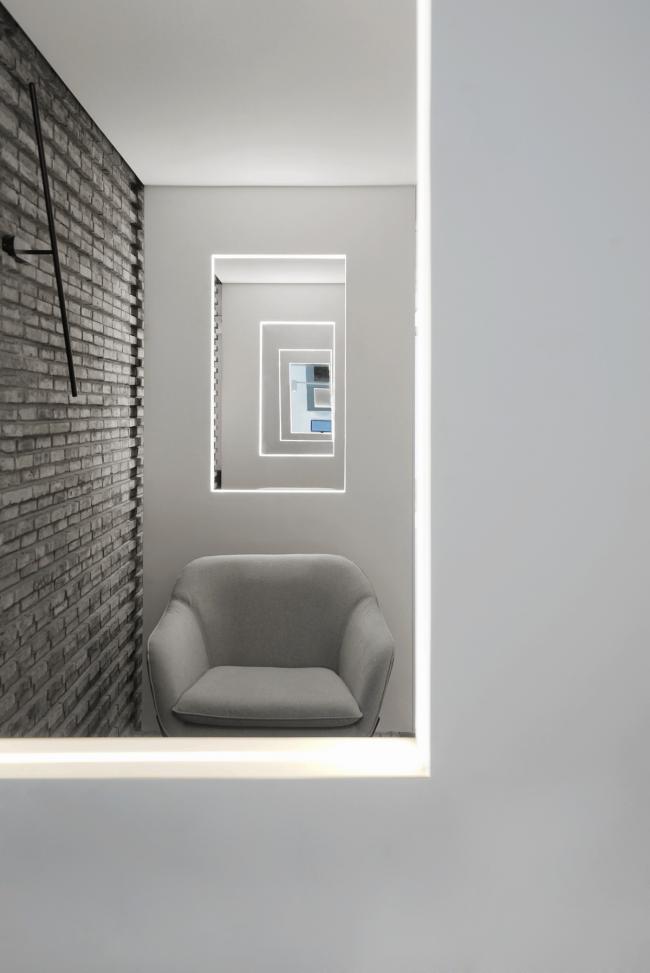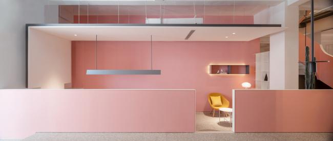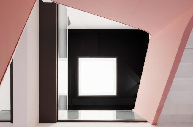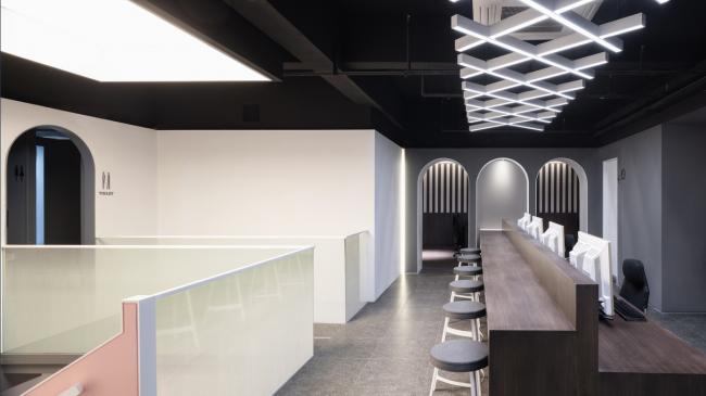 在一层中轴形成走道,将功能区规划在两侧,借半高墙体链接空间,使空间产生分离又统一的错觉。二层的黑白配色若代表男性的阳刚,一层的粉则是女性的柔美。