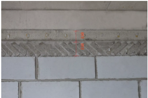 在粉刷前,在预留止口部位与砌体墙交接处,铺设抗裂钢丝网片,各基体间的搭接宽度为150mm。