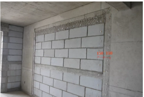 完成铺网,对砌块墙面喷浆后,进行砌体墙面粉刷,抹灰层厚度为15mm。剪力墙装配式研发为清水免粉刷,填充墙面粉刷至结构剪力墙、连梁预留止口结束。