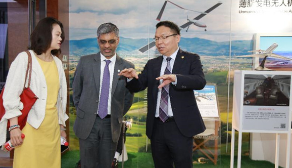汉能薄膜发电集团执行董事兼高级副总裁张彬(右)向美国绿色建筑委员会&绿色事业认证公司总裁兼首席执行官马晗先生(中)介绍汉能“建筑造能”产品
