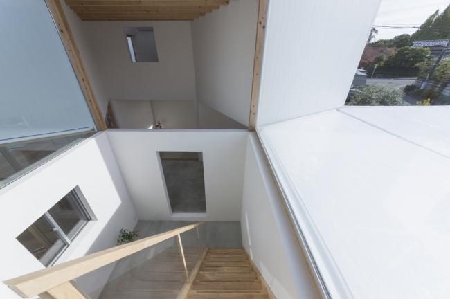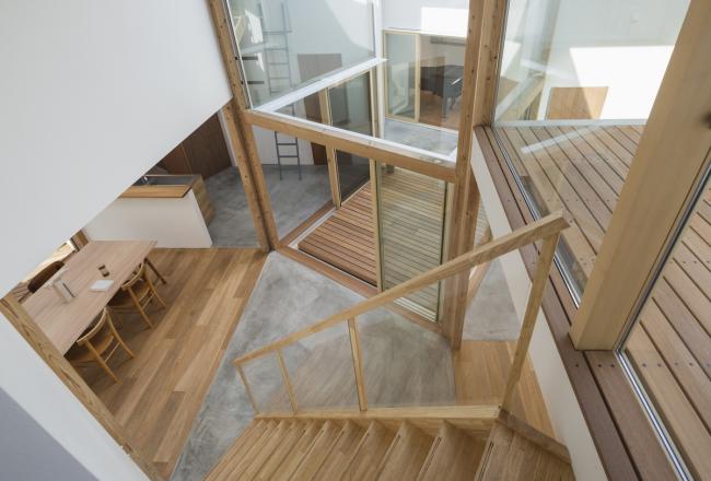 结构由木材构成,每一个方形平面都仅由柱子支撑,尽管其形式独特,但其内部却呈现出宁静的氛围。这所房子的设计有一个简单的类似于在老房子中使用的“一个正方形内的十字架”的平面。每一部分都代表着不同的品质,同时也具有兼容性和可扩展性,有可能出现各种路径。这座房子充满了能够适应生活方式变化的自主空间;它是一个透明的迷宫,空间反复反射成棱柱形。