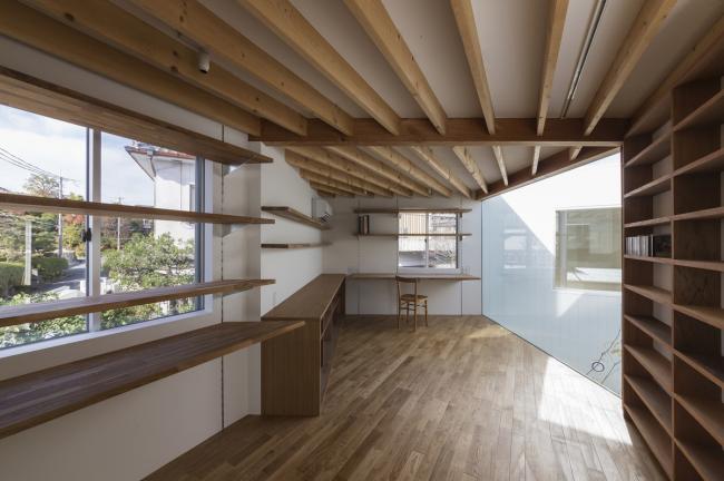 北斋之家是为一个希望享受充满日常发现的生活,欣赏彼此存在的家庭而设计的住宅。由于他们想要有很多房间,12个2.895米的正方形由两个正三角形组成的菱形连接。在早期的研究中,我已经通过制作模型体验到这种图形中的潜力。随着12个正方形逐渐变成18个正方形的序列,选择了一个与场地较好契合的位置,从不同角度创建动态图形。主要功能放在平面的方形部分,菱形区域没有定义,可以自由使用。