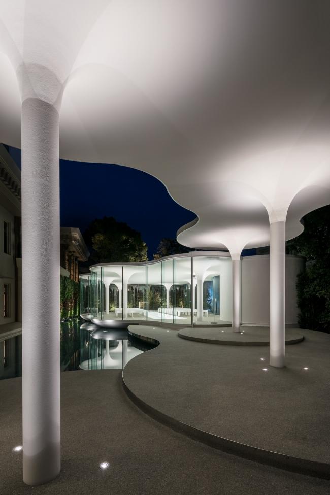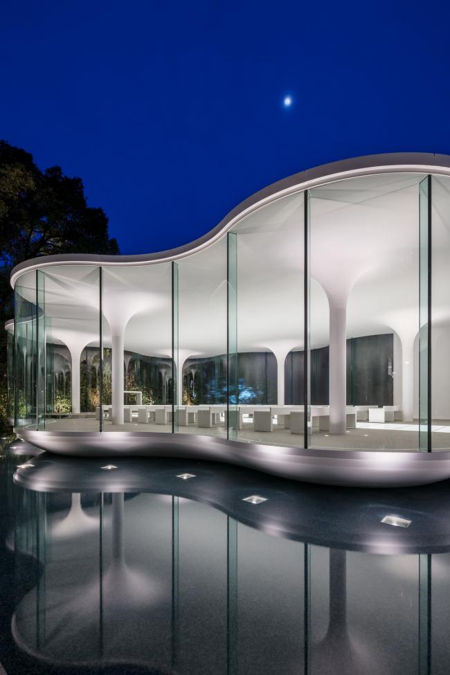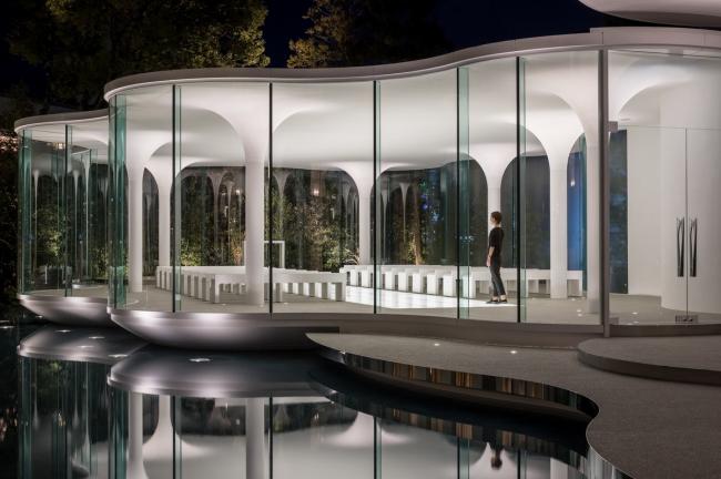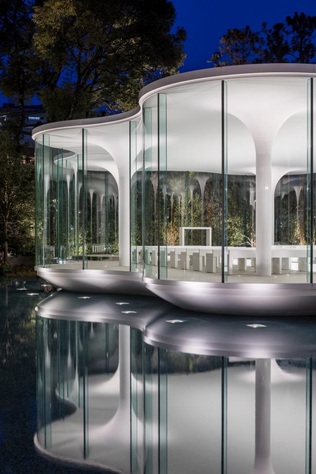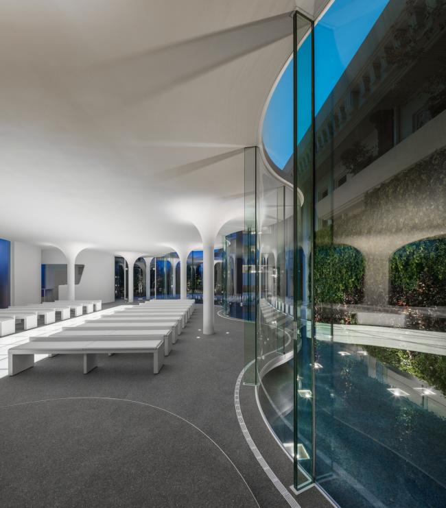 面向水池一侧的圆拥有一个双曲线形的基座,从而营造出一种漂浮教堂的印象。水面映射着这漂浮着的小教堂,为建筑增添了更多轻盈的情趣,并将梦想延伸到其他维度。